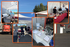 Customers enjoying food & friends / Customers checking out giveaways & talking with GM Darrin / Employees working the giveaway tables / Give away tables